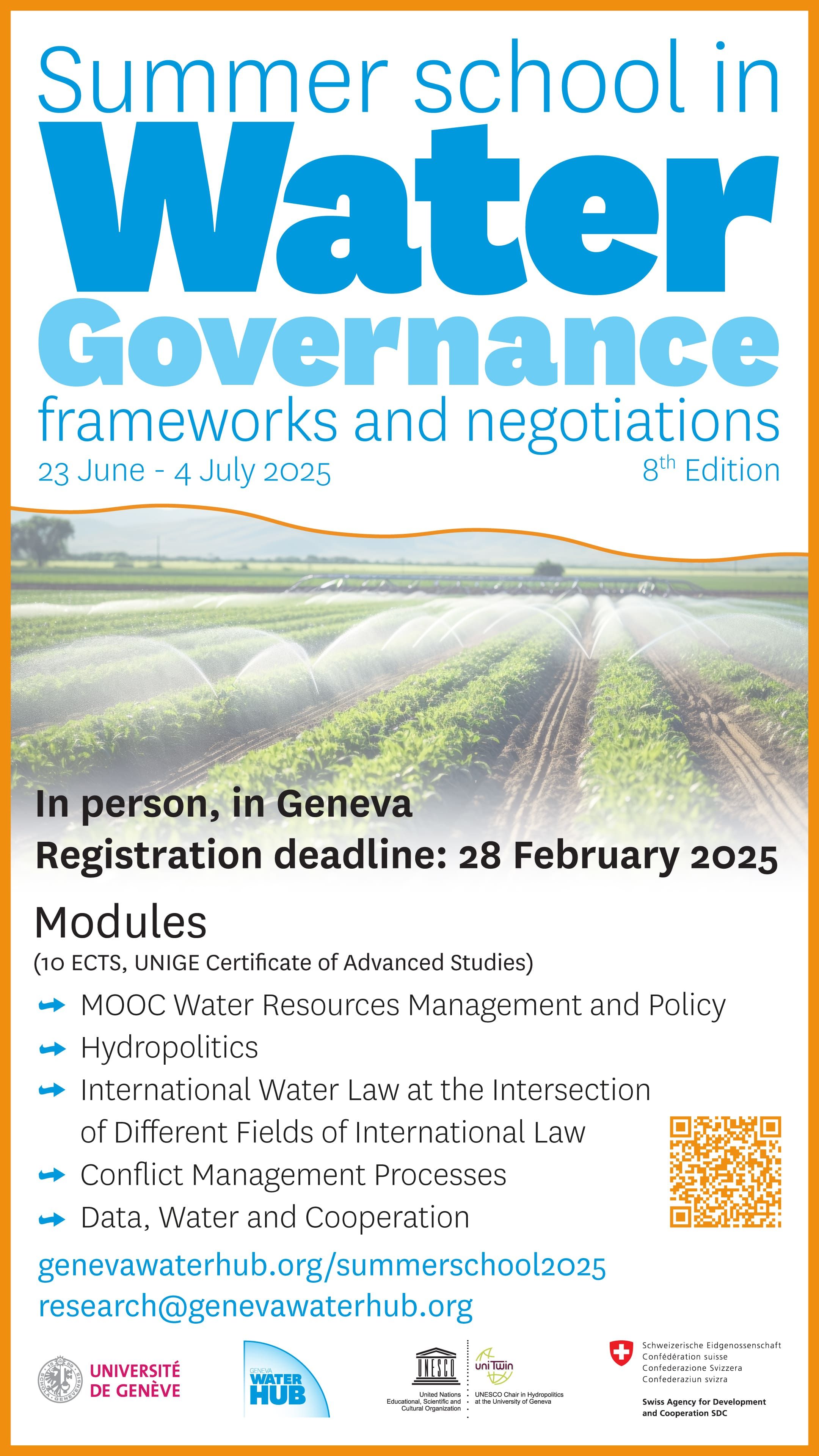 The Geneva Water Hub is launching the 8th edition of its Summer School on “Water Governance: Frameworks and Negotiations”, taking place in person in Geneva from 23 June to 4 July 2025.