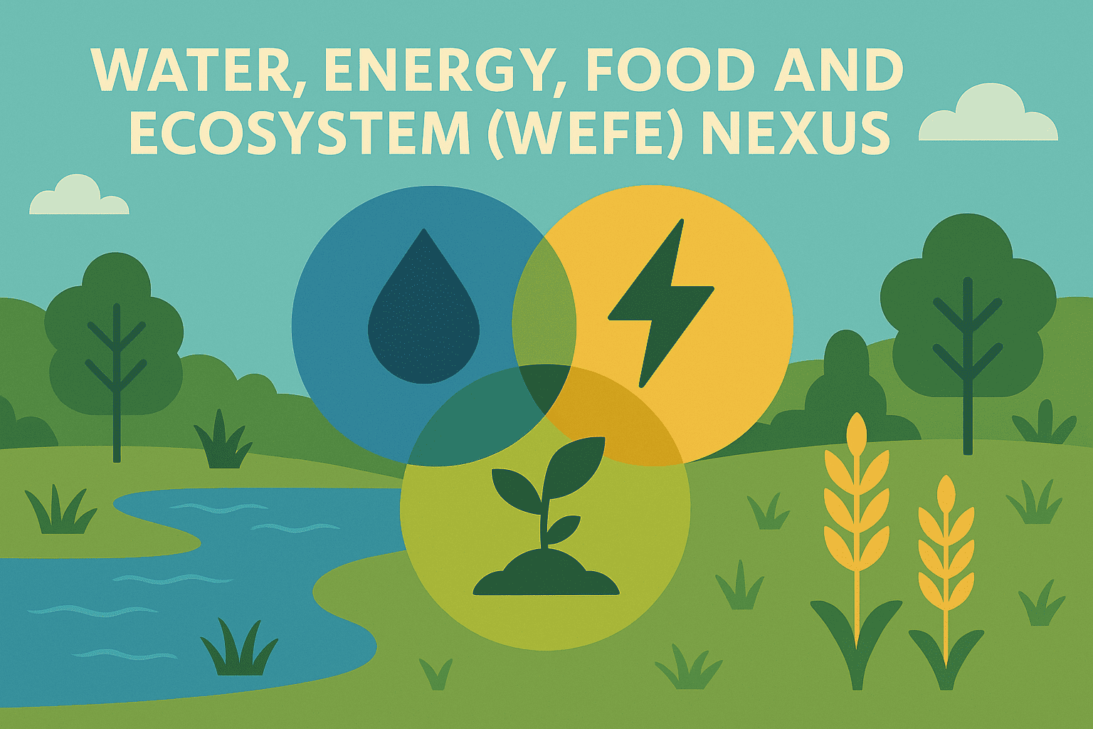 The Water, Energy, Food, and Ecosystem (WEFE) Nexus is an integrated framework that highlights the interconnections and interdependencies between water, energy, food, and ecosystems. It emphasizes the need for a holistic approach to managing these resources sustainably to ensure security and resilience in the face of growing global challenges such as climate change, population growth, and environmental degradation.