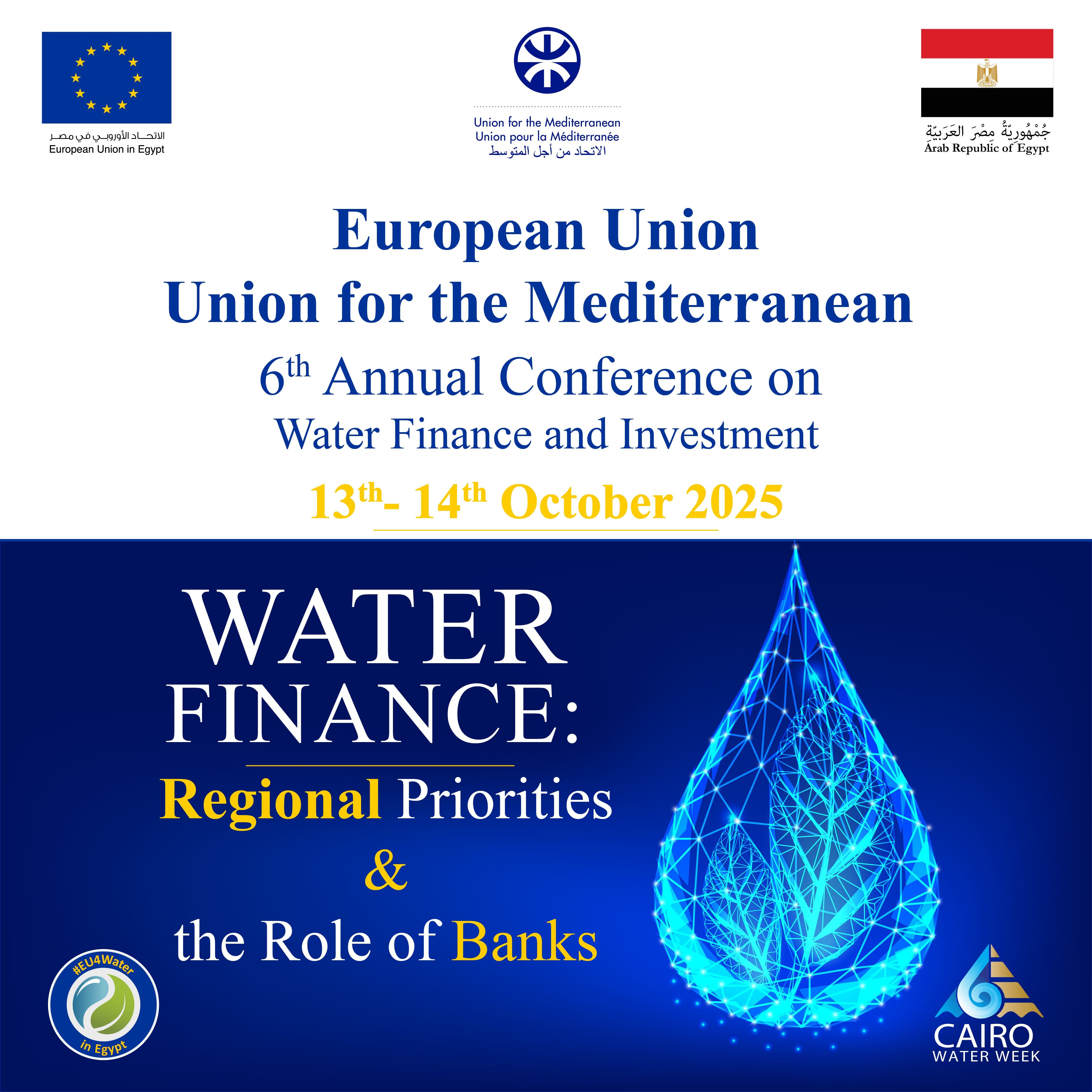 13–14 October 2025, Cairo (Egypt) – The 6th Annual Conference on Water Finance and Investment will take place in Cairo on 13-14 October 2025. It is co-organized by the UfM and the European Union Delegation in Cairo in the framework of Cairo Water Week. Our partners include African Development Bank, GWP-Mediterranean, Ministry of Water Resource and Irrigation of Egypt, OECD, and Union of Arab Banks.
